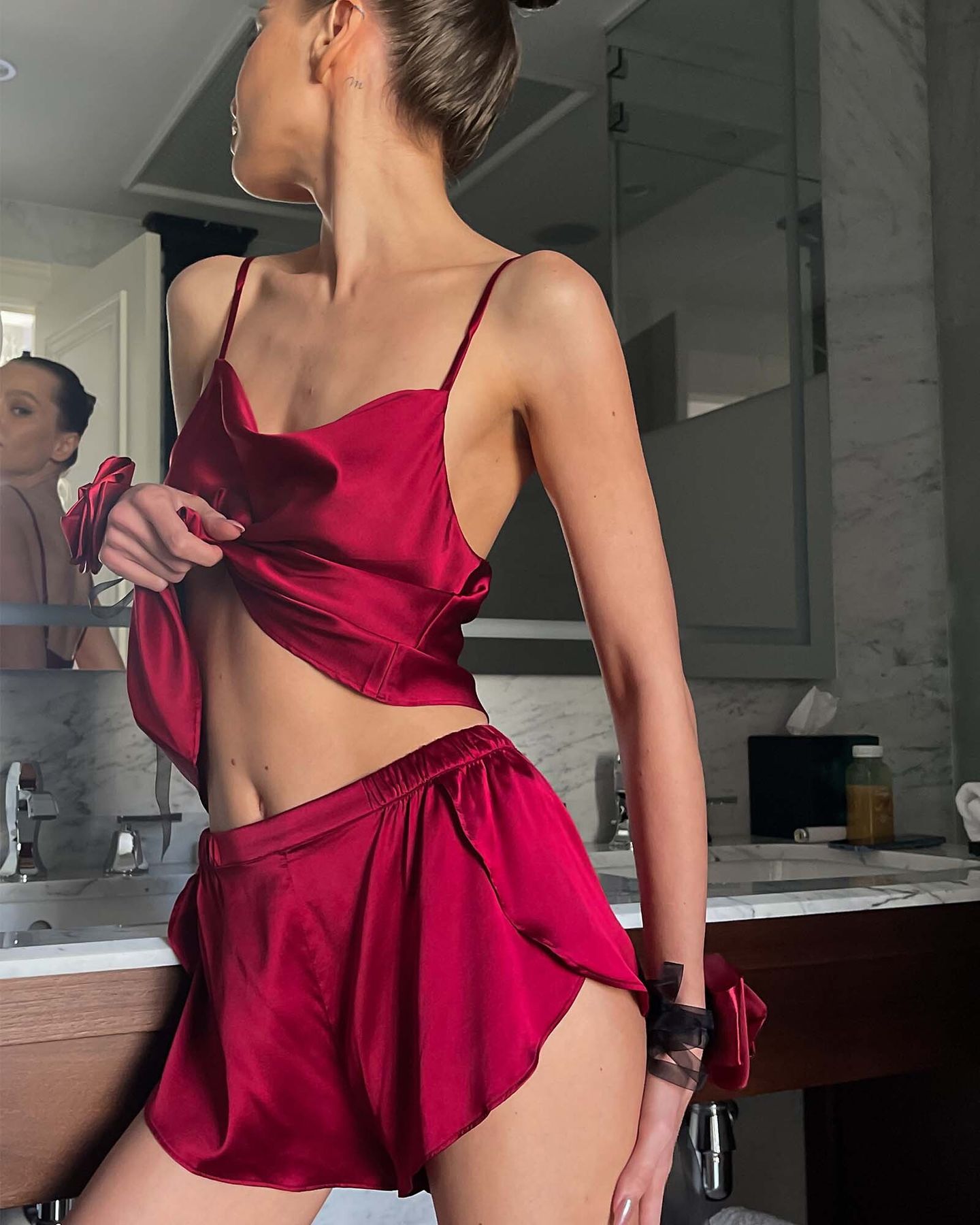 Эластичный пояс выполнен с использованием премиальной технологии двойного закрытого шва, обеспечивающего мягкое прилегание без давления. Нижний край обработан узким московским швом, подходящим для деликатных тканей — каждый штрих в этих шортах продуман до мелочей.