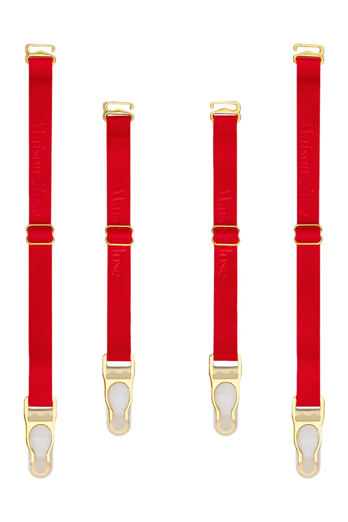Комплект включает четыре съёмных и регулируемых бретели-подтяжки, выполненные из эластичного нейлона с фирменным тиснением Maison Close. Универсальная система креплений позволяет сочетать их с любыми поясами и изделиями бренда, создавая индивидуальный образ.