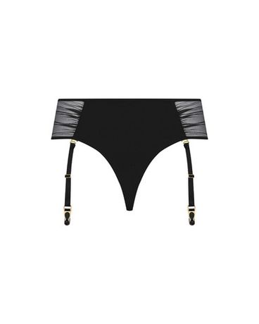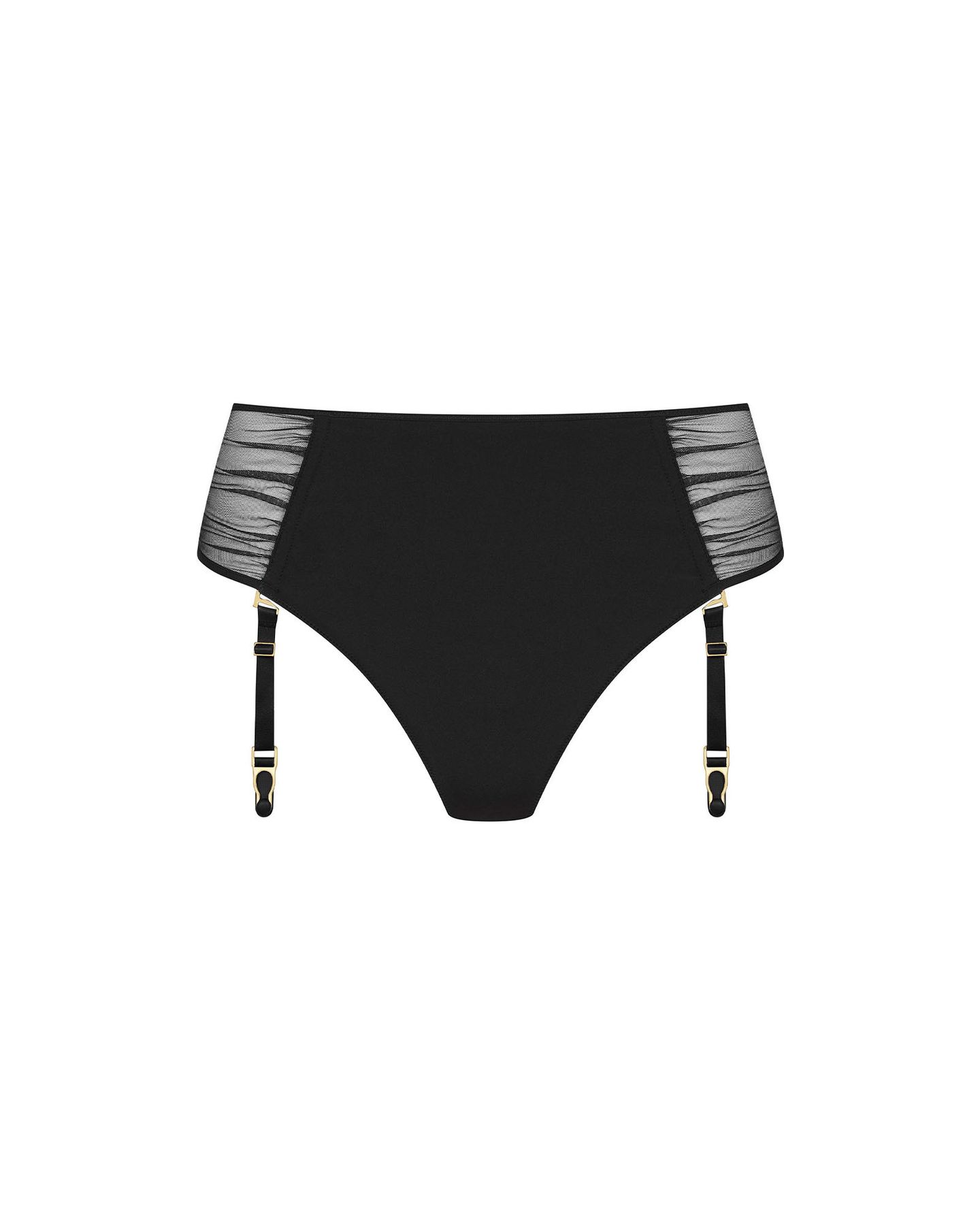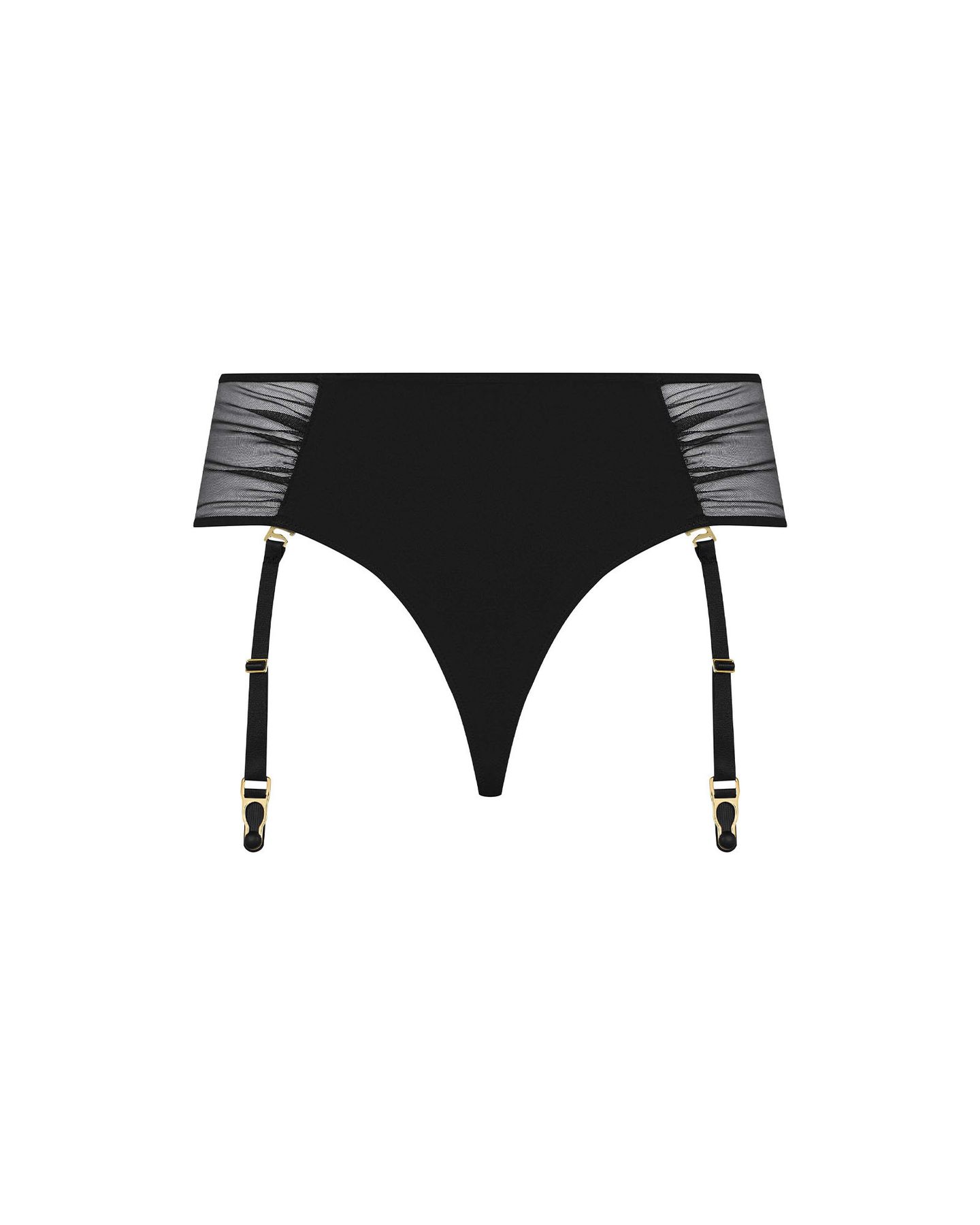 Трусы-танга Nuit fauve бренда Maison Close с высокой посадкой и стрепами для чулок соединяют чувственность и практичность. Лаконичный чёрный силуэт подчеркивает линии фигуры, а графичные вставки создают акцент на бёдрах. Функциональные стрепы позволяют легко дополнить образ чулками, превращая изделие в полноценный элемент комплекта.
