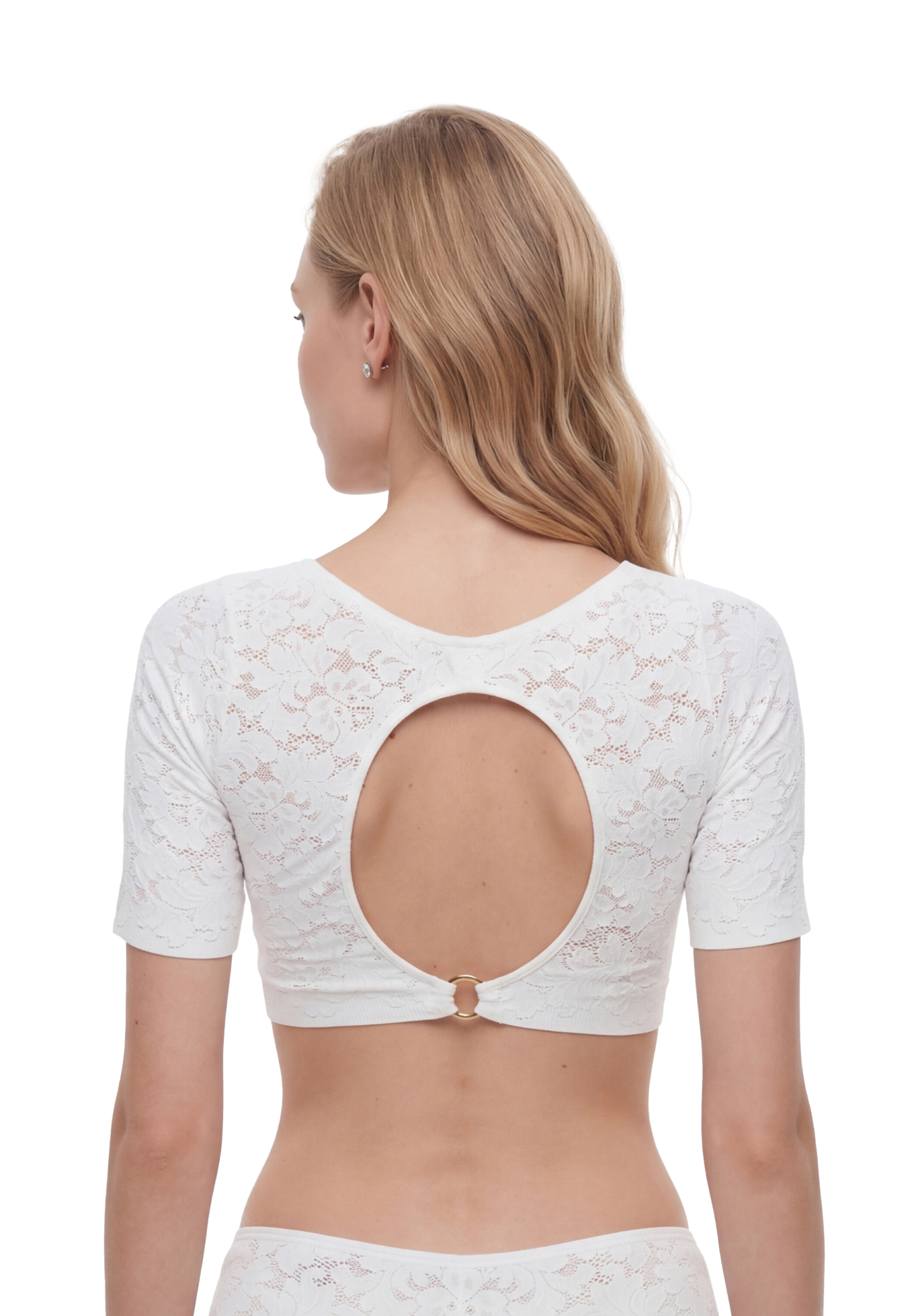 Кружевной топ с рукавом до локтя — изысканное сочетание женственности и комфорта. Цветочный узор кружева создаёт лёгкий и воздушный образ, а эластичная ткань мягко садится по фигуре, подчеркивая её линии. Универсальная длина и классический крой делают модель подходящей как для романтичных образов, так и для стильных комбинаций в повседневности.
