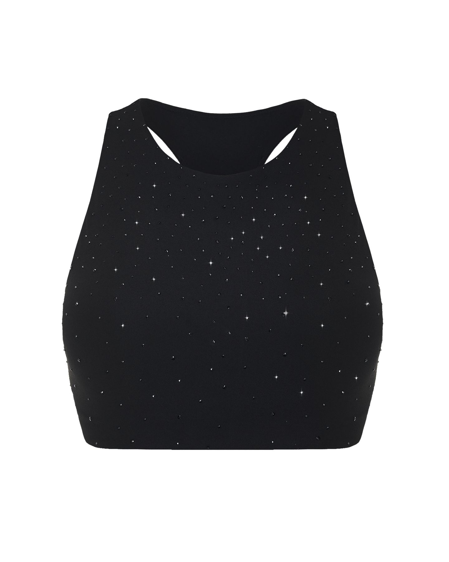 Топ Aurora — воплощение света, движения и абсолютной свободы. Высокий вырез, плотная посадка и спортивная спинка создают ощущение защищённости, а рассеивающиеся по поверхности стразы ловят каждый луч света, превращая активность в спектакль. Этот топ легко впишется и в тренировку, и в вечерний образ — достаточно сменить контекст.