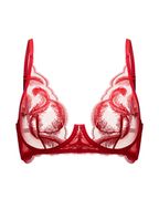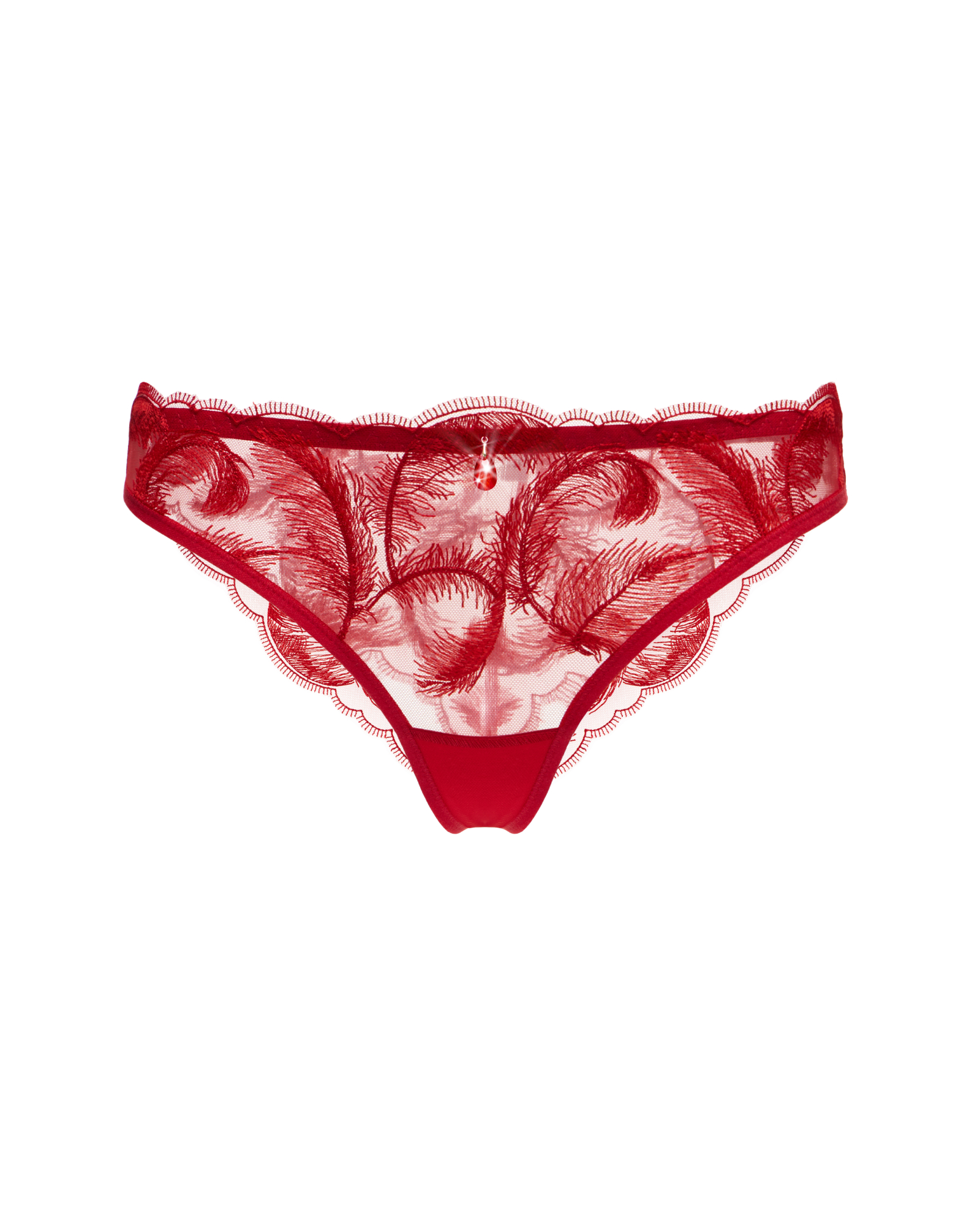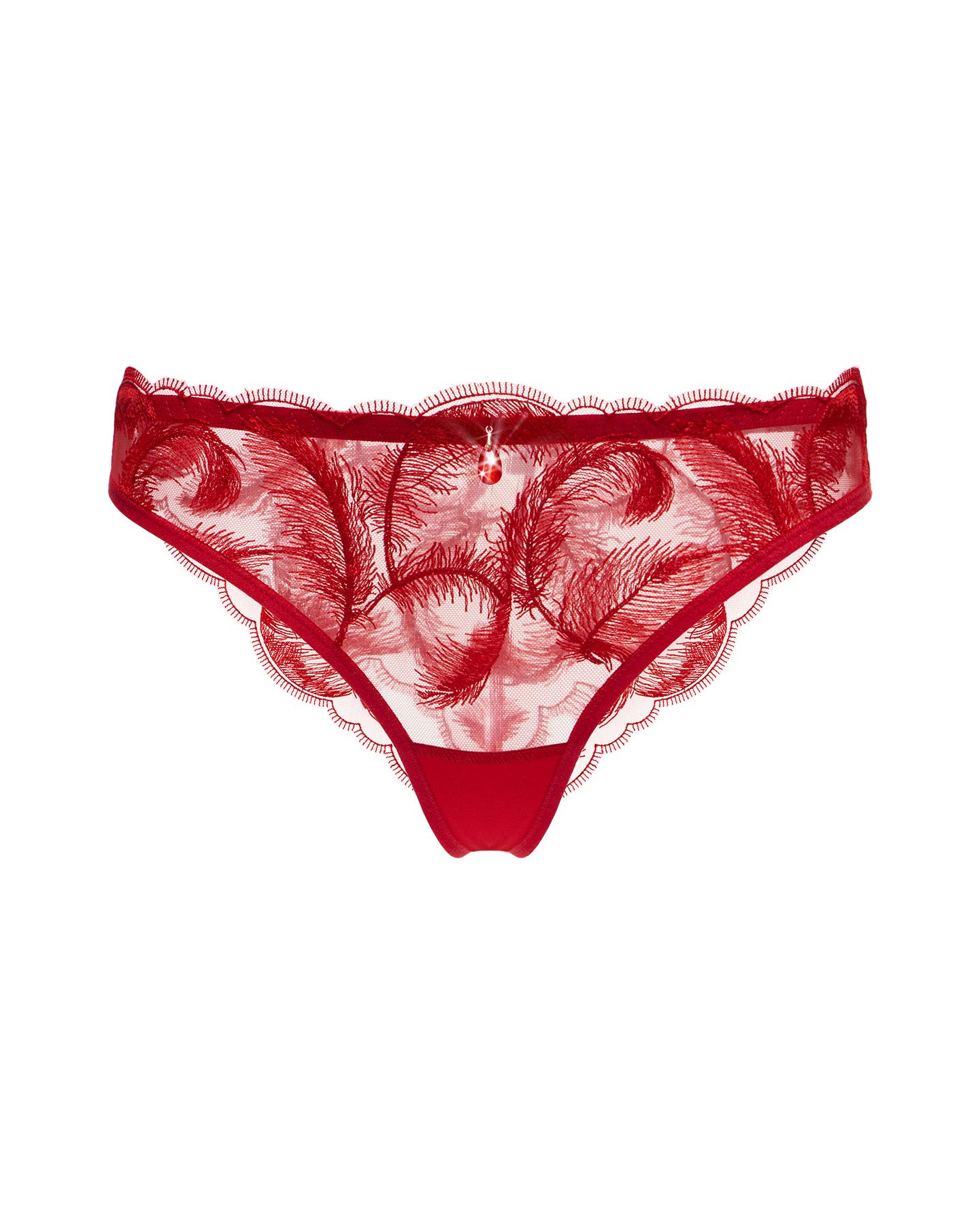 Модель выполнена из мягкой красной сетки с вышивкой в виде воздушных перьев, которые создают ощущение движения и парящей невесомости.