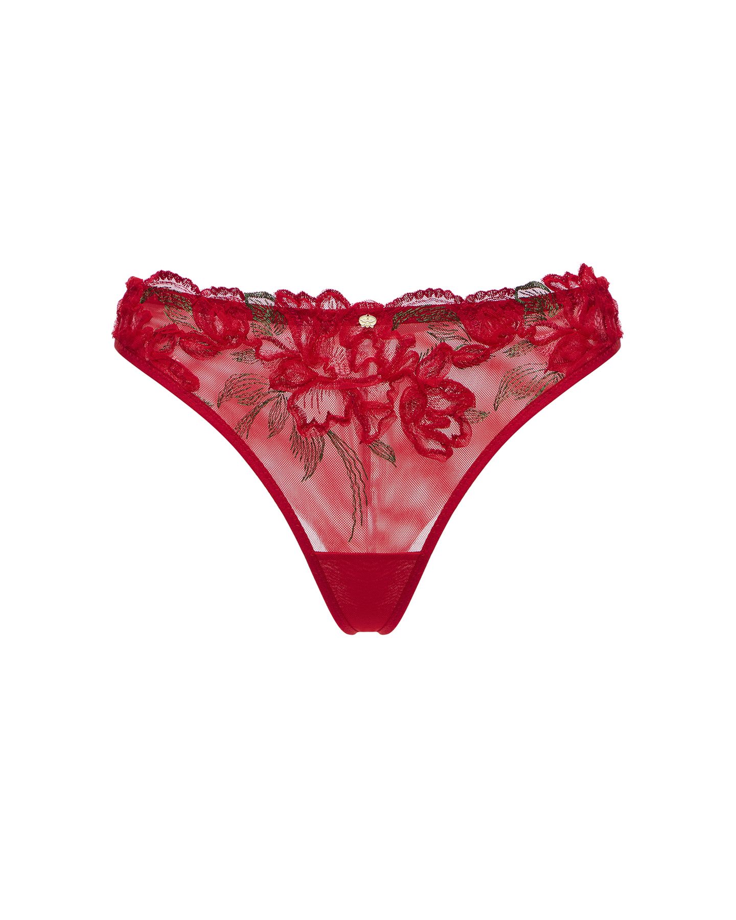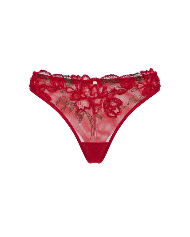 Трусы-бразилиана Passion продолжают алхимию огня и кружева, превращая каждый штрих в живую вспышку цвета. Объёмные пионы цвета спелого граната, вышитые на эластичной сетке алого оттенка, будто пульсируют на коже — лепестки выполнены из нитей кроваво-красного, гранатового и алого тонов, а тончайшие листочки приподняты сетчатой лентой, создавая ощущение рельефа и движения. Линия выреза подчёркивает изгибы, визуально вытягивает ноги и оставляет ощущение невесомости на теле. Бразилиана завершает комплект Passion, превращая его в роскошный огненный ансамбль.