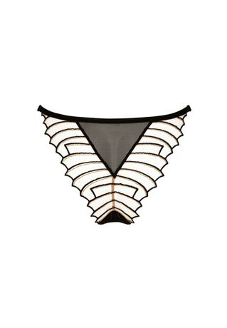 Трусы-стринги из тонкой прозрачной сетки с декоративными вставками по бокам создают образ, полный лёгкости и дерзости. Ажурные элементы подчёркивают линию бёдер, добавляя игривый акцент. Миниатюрная золотая деталь спереди завершает дизайн и делает модель особенно утончённой.