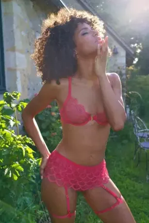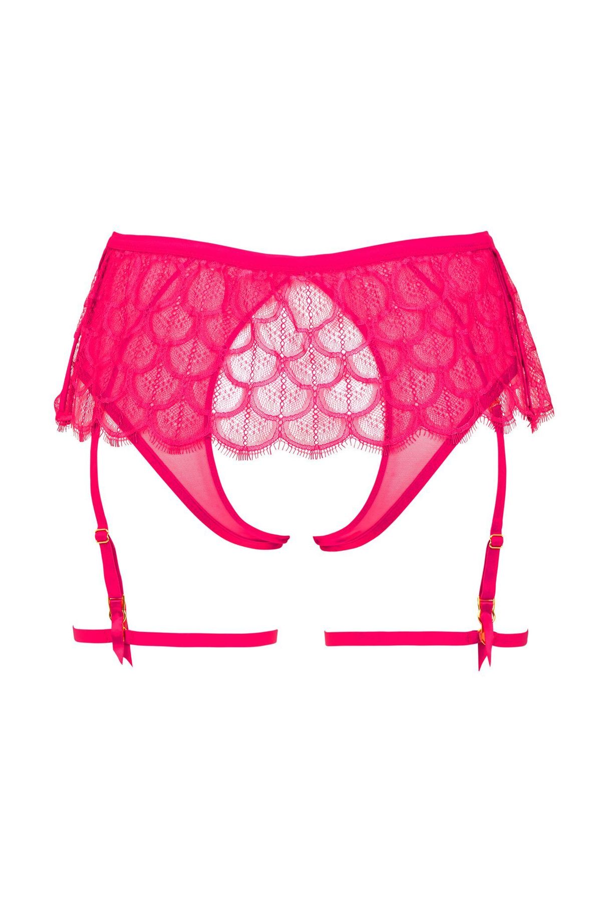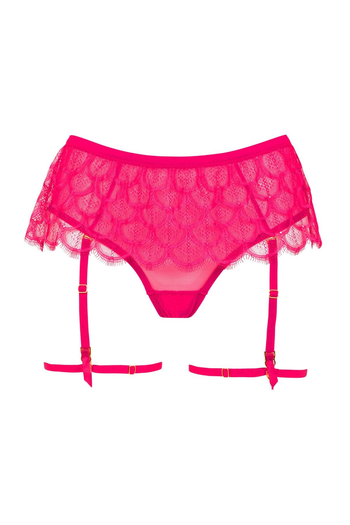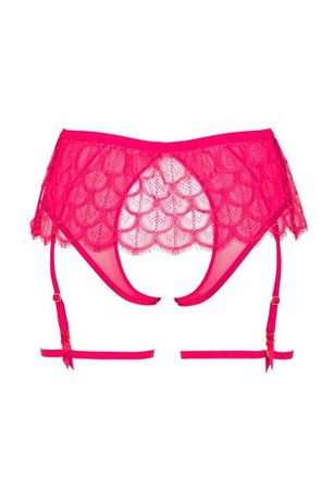 Яркий пояс для чулок в оттенке фуксия создаёт эффект игривого акцента и подчёркивает талию. Кружевное полотно с фигурным краем напоминает лёгкую юбку и добавляет образу динамики.