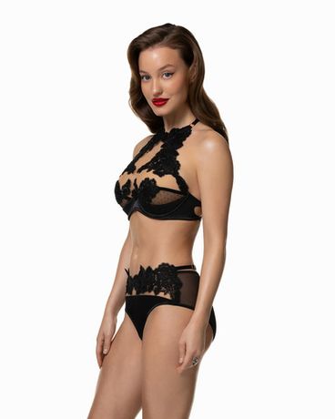 Трусы Kiara — воплощение дерзкого шика и изящной архитектуры. Модель выполнена из мягкой эластичной микросетки и дополнена плотной вышивкой, вручную разложенной на полупрозрачной основе. Завышенная линия талии подчёркивает изгибы, а дополнительный декоративный пояс с застёжкой придаёт образу завершённость и графичность.
