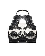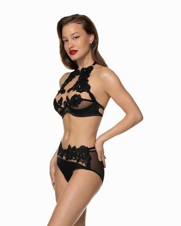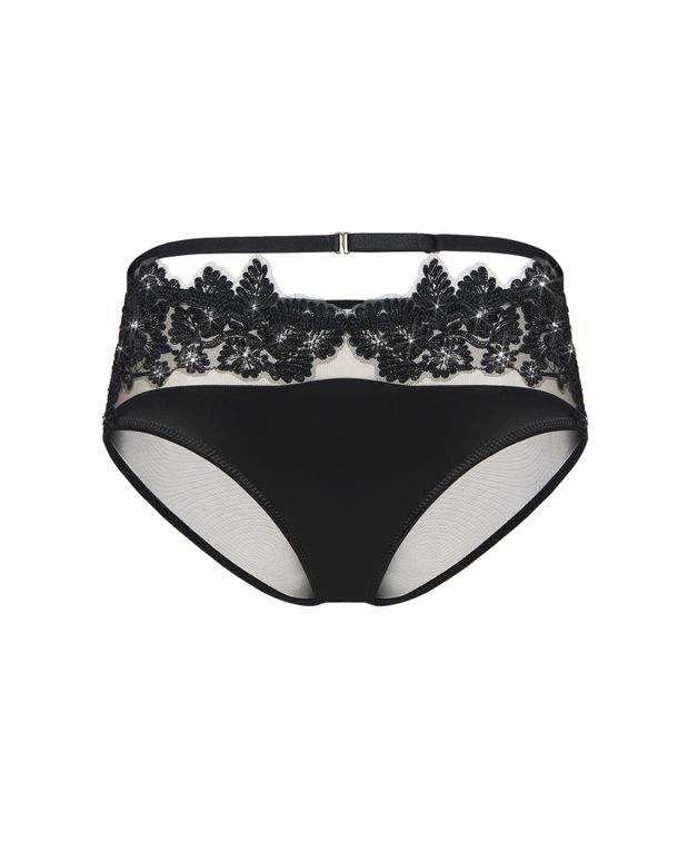Модель выполнена из тонкой телесной сетки, на которую вручную нанесена объёмная вышивка. Передняя часть украшена мерцающим орнаментом, задняя — выполнена из сетки в тон для легкости и невидимости под одеждой. Эластичная лента на талии обеспечивает комфортную посадку и подчёркивает линию бёдер.