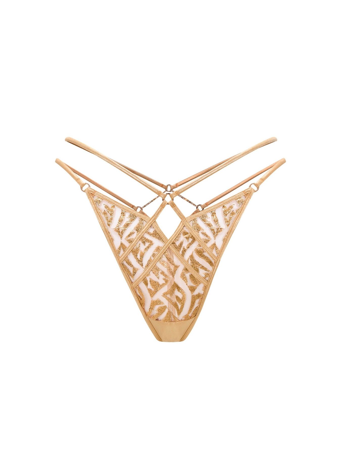 Трусы стринги Awena — это настоящее украшение бельевого гардероба, в котором соблазнительный дизайн сочетается с лёгкостью посадки. Модель выполнена из тончайшего тюля с вышивкой золотистыми нитями, создающими эффект мерцающего орнамента на коже.