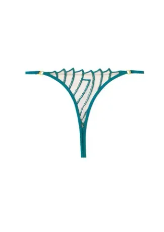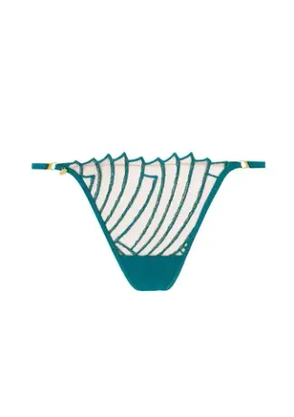 Трусы-стринги в изумрудном оттенке созданы для тех, кто выбирает смелые акценты и минимум прикрытия. Прозрачная сетка с графичной вышивкой формирует изящный узор, визуально удлиняющий силуэт и подчёркивающий изгибы.