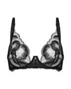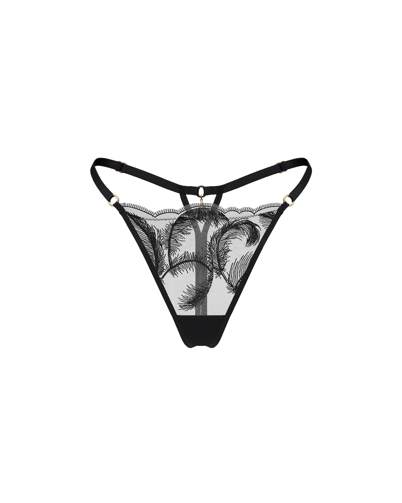 Минималистичный крой подчёркивает изгибы тела, а тонкие эластичные перемычки с регулируемой посадкой обеспечивают комфорт и точную посадку. Контраст вышивки и прозрачной основы создаёт иллюзию парящей тени на коже.