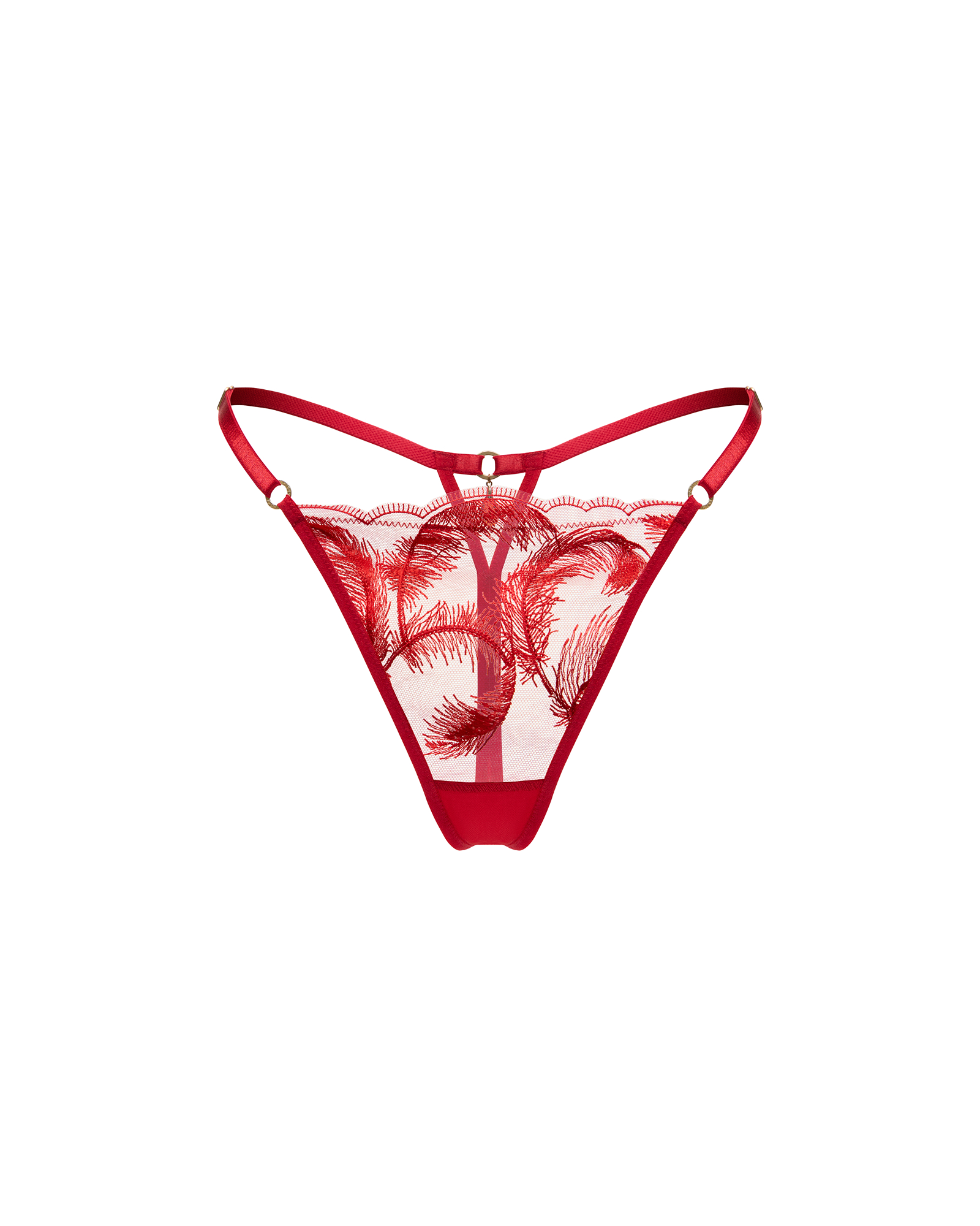 Минималистичный крой подчёркивает изгибы тела, а тонкие эластичные перемычки с регулируемой посадкой обеспечивают комфорт и точную посадку. Контраст вышивки и прозрачной основы создаёт иллюзию парящей тени на коже.