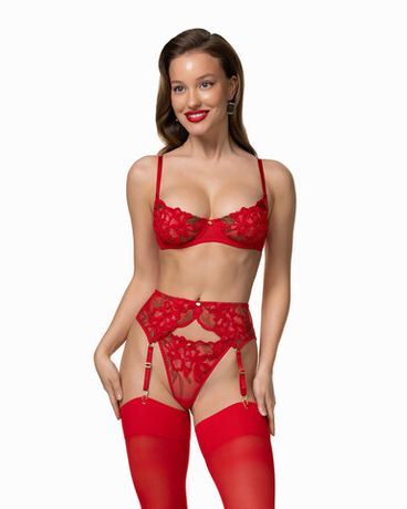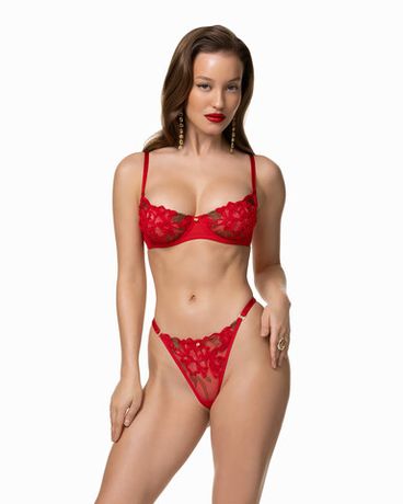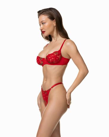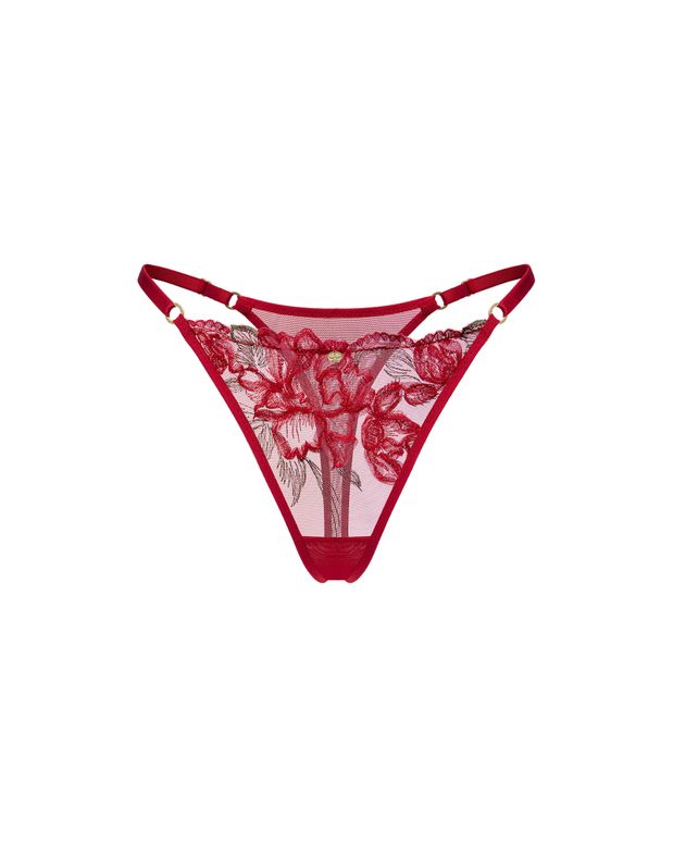 Трусы-стринги Passion продолжают алхимию огня и кружева, превращая классическую форму в выразительный акцент. Объёмные пионы цвета спелого граната, вышитые на эластичной алой сетке, будто пульсируют на коже: каждый лепесток выполнен из нитей кроваво-красного, гранатового и алого тонов, а тончайшие листочки приподняты сетчатой лентой, создавая ощущение рельефа и живого движения. Минималистичная конструкция стрингов подчёркивает изгибы тела, а тонкие боковые перемычки с золотистой фурнитурой визуально лёгкие, но надёжные. Стринги завершают комплект Passion, превращая его в цельный, художественно выстроенный ансамбль.