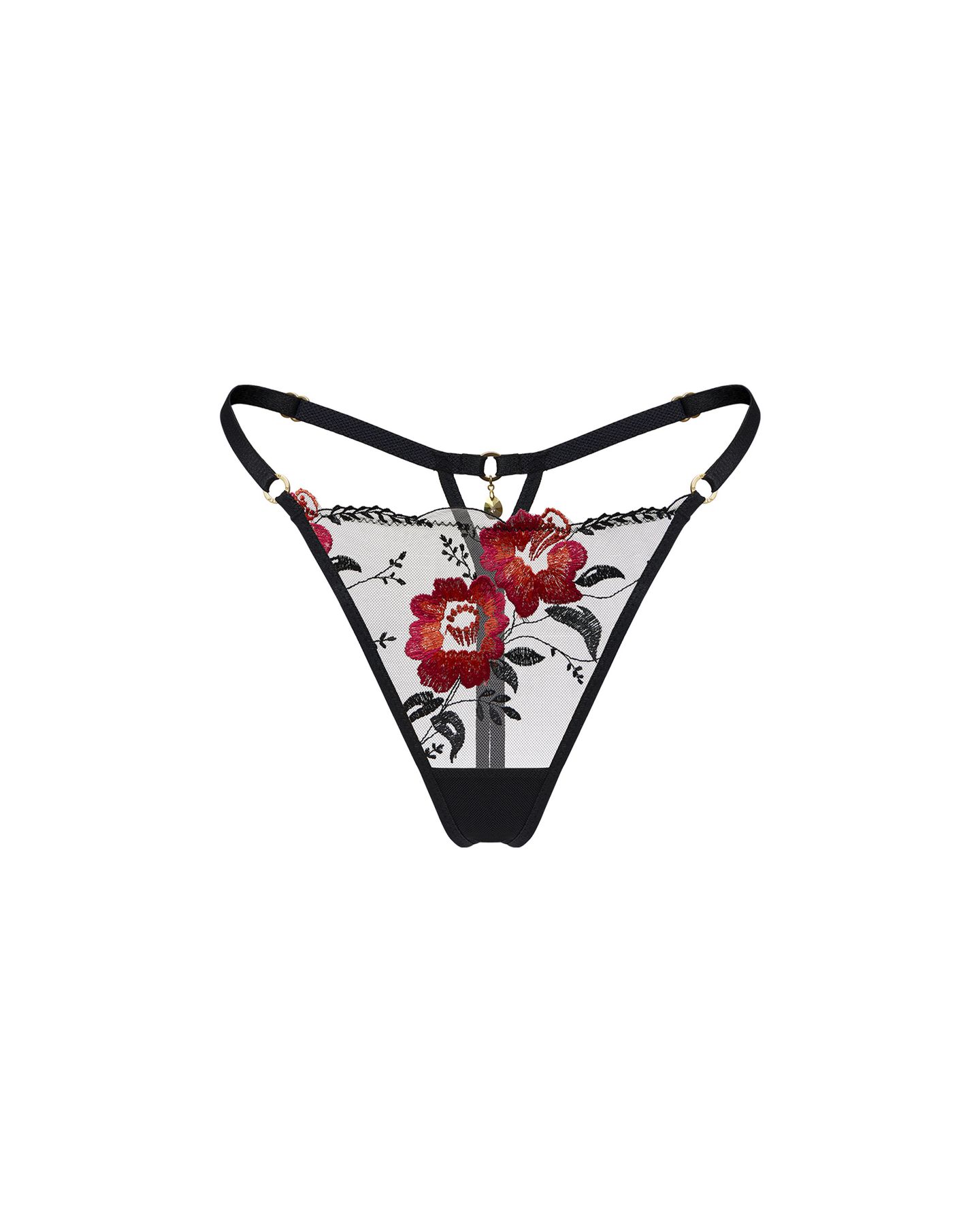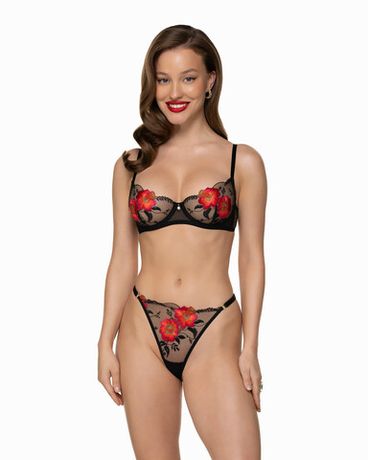 Стринги Phoenix Noir продолжают идею коллекции — вспышка пламени на прозрачной чёрной сетке. На передней панели распускаются алые амариллисы, вышитые с ювелирной точностью. Контраст оттенков создаёт эффект огненного свечения, которое подчёркивает линию бёдер и visually удлиняет силуэт.