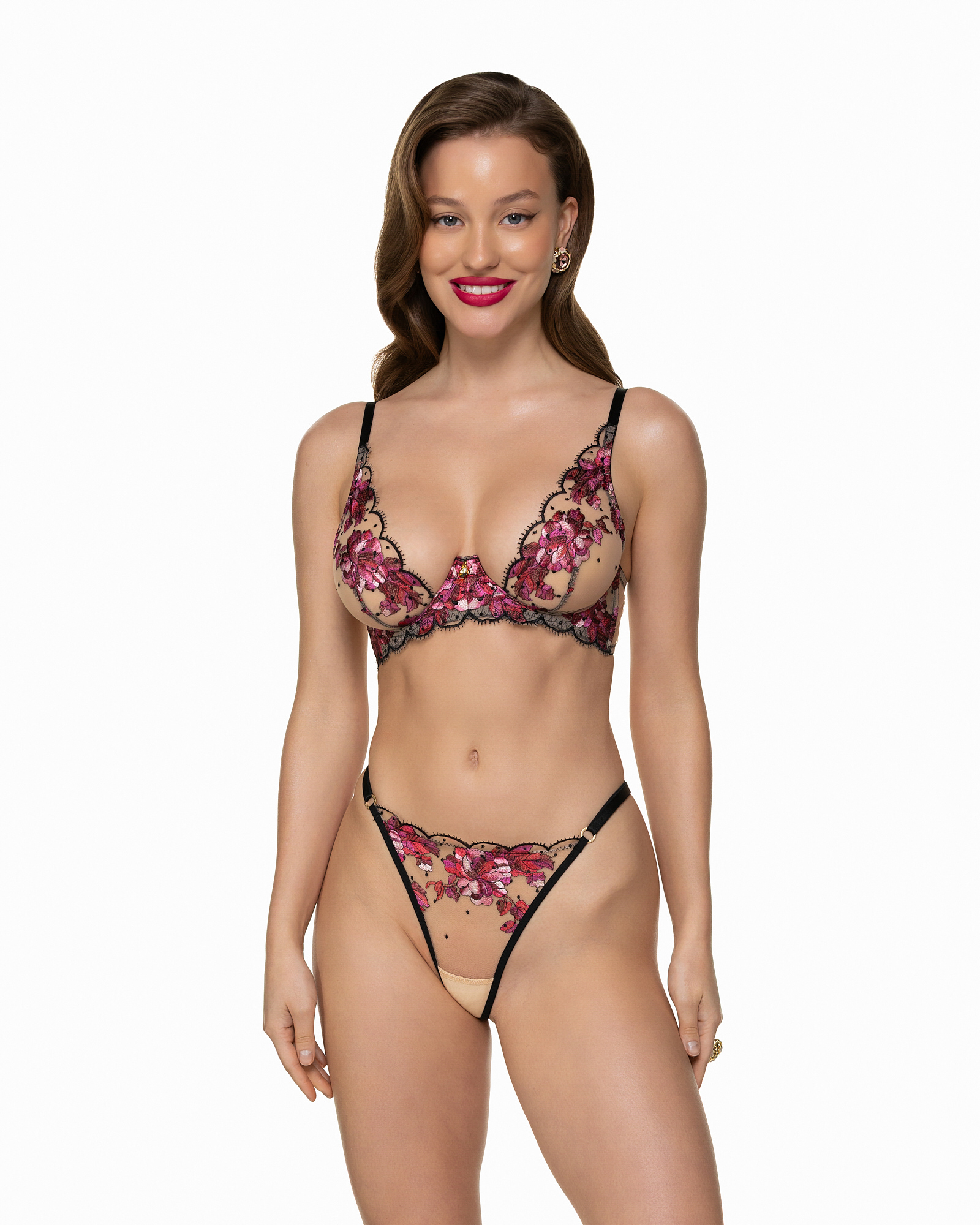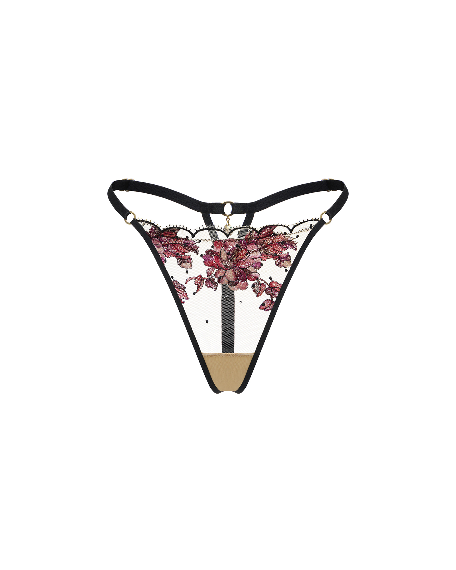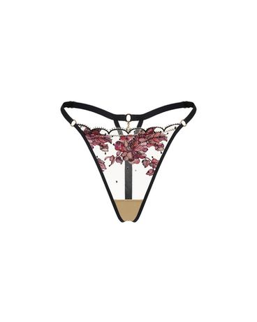 Трусы-стринги Rosa создают эффект ювелирного украшения на теле. Полупрозрачная телесная сетка сливается с кожей, позволяя цветочной вышивке расцвести прямо на теле. Центральный бутон акварельной розы становится визуальным акцентом, а тонкие эластичные полоски подчеркивают линию талии, словно графичная оправа.