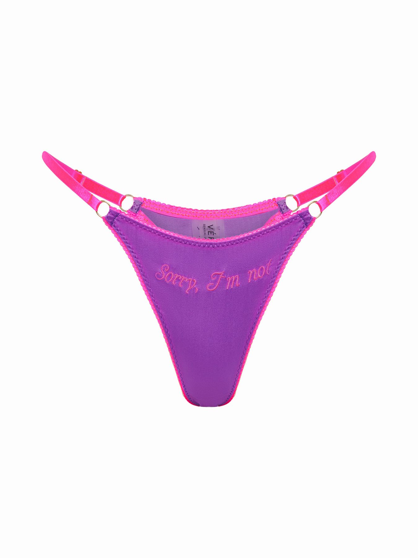 Фиолетово-розовые стринги из 100% натурального шёлка с дерзкой вышивкой Sorry, I’m not — для тех, кто не оправдывает ожиданий и делает это с удовольствием. Лёгкий блеск ткани подчеркивает настроение модели, а яркая цветовая комбинация не оставит шансов остаться незамеченной.