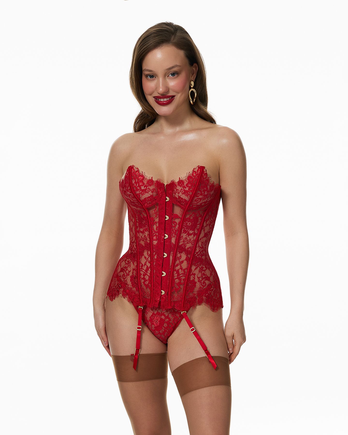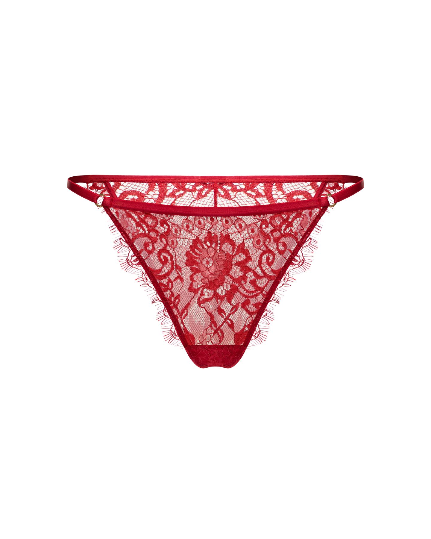 Трусы танга Mona выполнены из французского кружева шантильи с выразительным ресничным краем. Плотный, объёмный и фактурный рисунок мягко прилегает к телу, сохраняя прозрачность и ощущение лёгкости. Кружево подчёркивает линии силуэта и красиво работает в движении, создавая цельный образ в сочетании с корсетом Mona.
