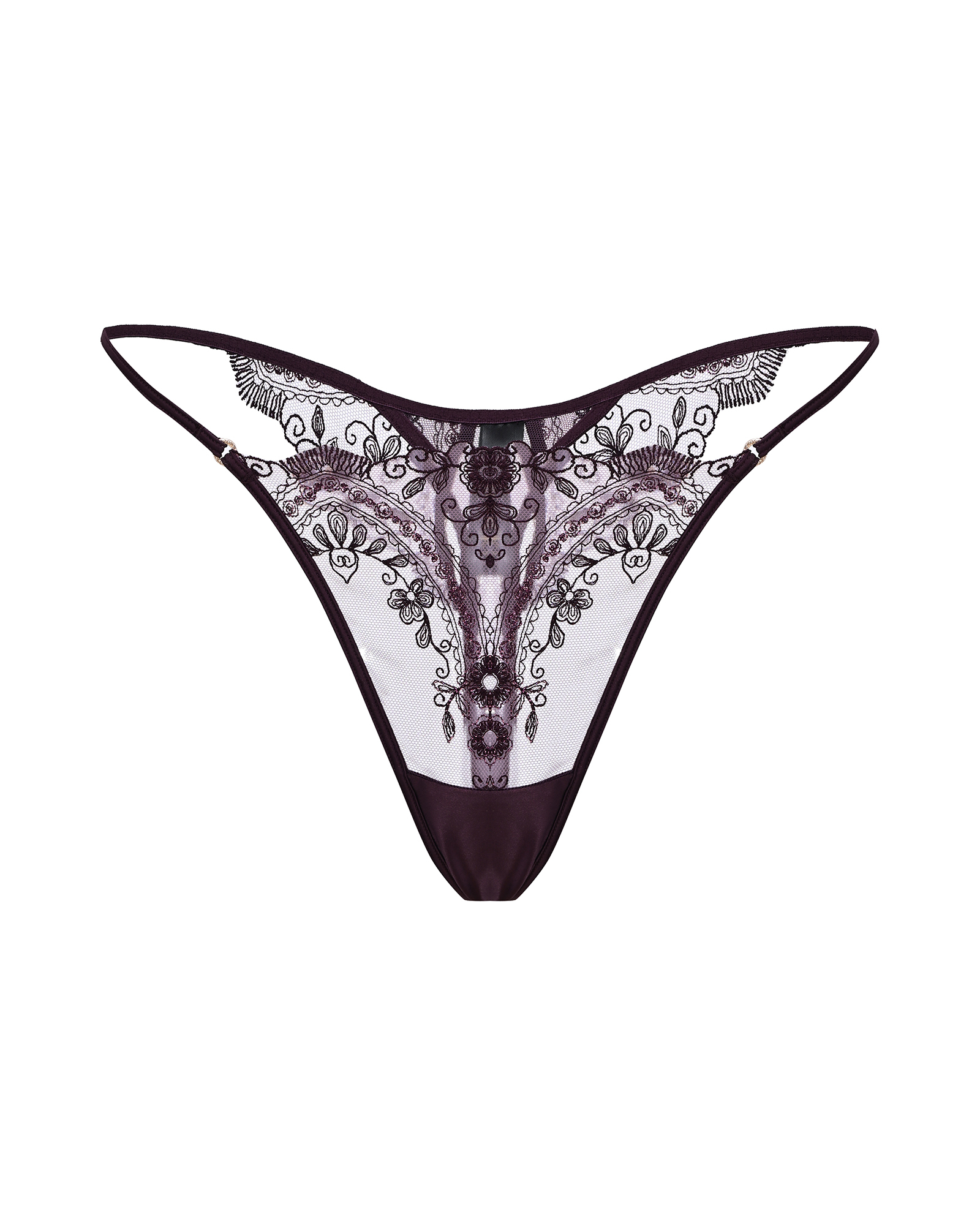 Провокационная модель в оттенке тёмного вина создана, чтобы соблазнять одним лишь силуэтом. Полупрозрачная вышивка на сетке мягко обрамляет ягодицы, а ключевой акцент — пикантный вырез — делает образ особенно дерзким. Цветочный орнамент напоминает татуировку на коже, подчёркивая её естественную красоту.