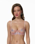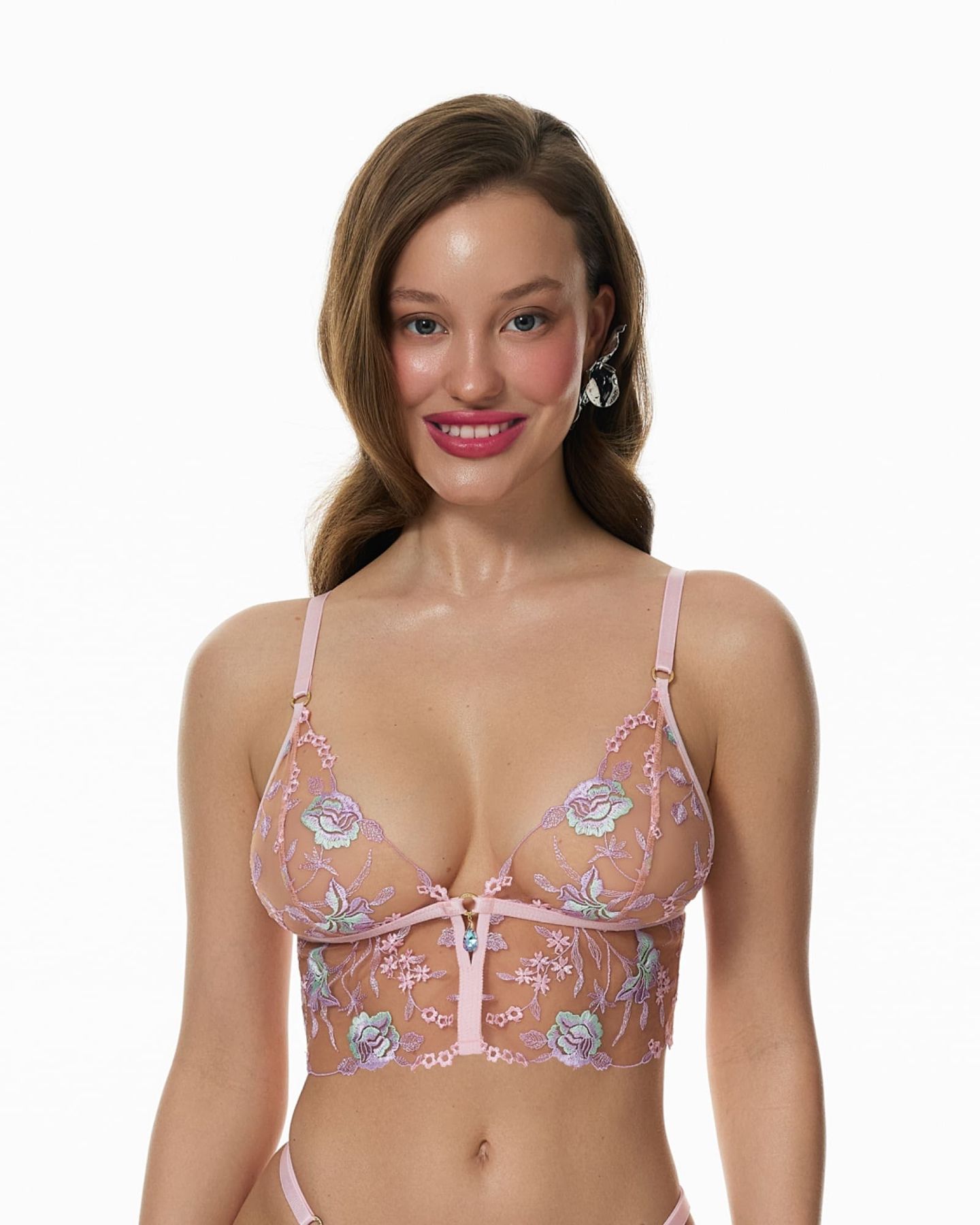 Бралетт Unicorn Magic выполнен из тонкой прозрачной сетки с детализированной флоральной вышивкой, которая мягко ложится на тело и создаёт эффект невесомости. Рисунок подчёркивает естественные линии и раскрывается в движении, добавляя образу глубину и лёгкость.