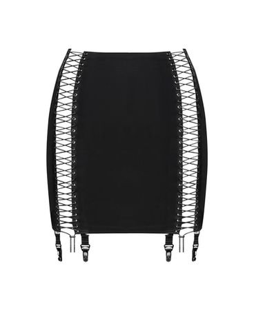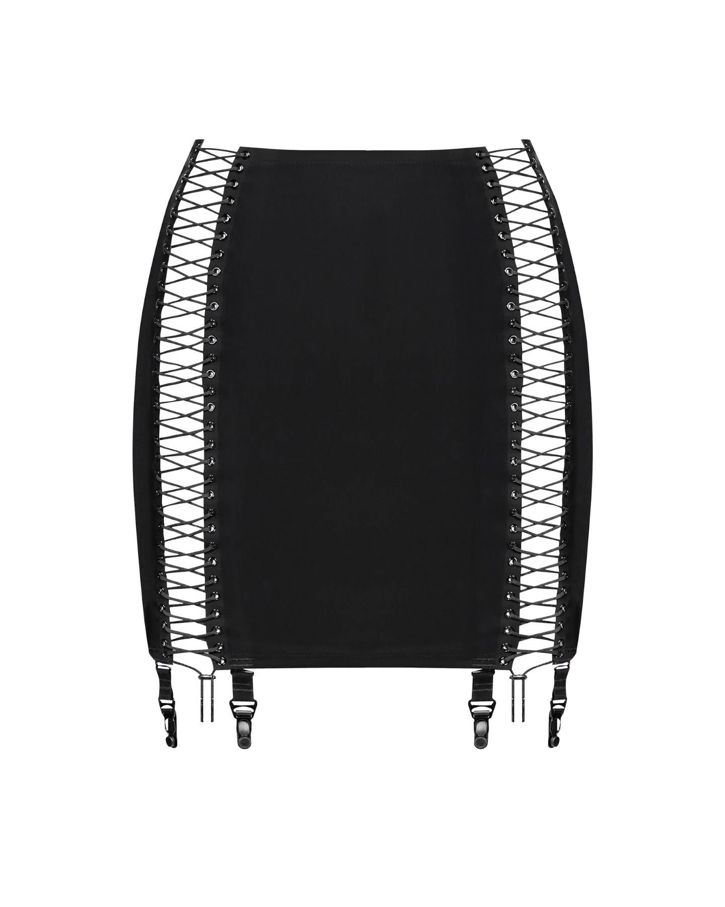 Юбка-пояс для чулок бренда Maison Close из микрофибры создана для эффектных образов с акцентом на линии силуэта. Модель украшена декоративной шнуровкой по бокам, которая регулируется и позволяет варьировать посадку. Плотная эластичная ткань мягко обхватывает тело, подчеркивая изгибы и визуально стройня фигуру.